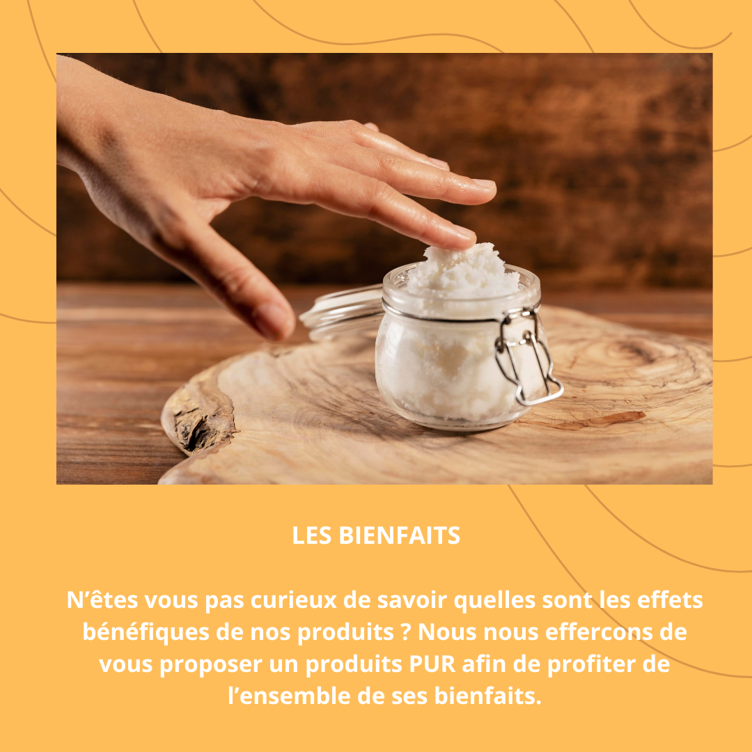 Hydratant, réparateur et protecteur, notre beurre de karité prévient et soigne votre peau et cheveux.